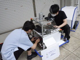 ![]() ロボットの回路部分を調整中の学生 (酒井 准教授) |