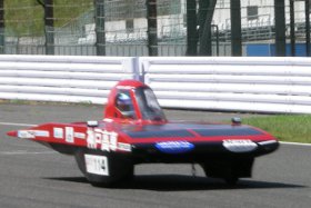 ![]() 今年から旧白浜空港でのレースとなり、鈴鹿とは全く違う状況であった。午前・午後の二部制、計5時間の本戦になった。また路面を考慮し、パンクしないようバイク用のタイヤで挑んだ。 レース予選は大雨により中止。しかし本戦当日、ソーラーパネルを最大限に活かせる晴天であった。 スタート後は順調に走行し、好調な走りを見せる。コースアウトやキャノピーの固定が甘い等のトラブルが見られたが、午前のレースはクラス内で1位をキープした。午後の部では問題なく走行できたが、相手チームに抜かれ、2位での決着となった。 参加クラスはビギナークラス(5時間耐久 発電量480W以下) 結果は、2位/3台 総合10位 92周 |